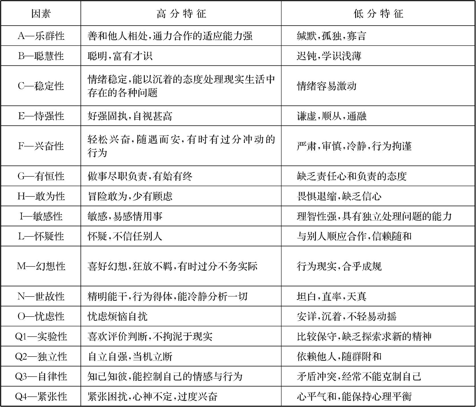 卡特尔是美国心理学家,主张特质理论。他把特质看做是人格的积木,并将其分为表面特质和根源特质。表面特质(surface trait)是彼此关联的、可以通过观察得到的行为或特征的集合。例如,受的教育越正规,看的电影就越少。这种观察到的资料是表面的东西,解释不了什么。它们是简单的一类特性组合在一起,这样的特性可能有许多根源。根源特质(source trait)是决定表面特质、支配个人一贯行为、作为行为或特征根源的基本人格因素,它们是个体人格结构中最重要的组成部分。这样,每一表面特质由一个或多个根源特质引起,一个根源特质能影响到几个表面特质。为了寻找和确定这些根源特质,卡特尔首先从字典中收集了17953个描述行为的形容词。他认为,如果能够收集到描述行为的全部词汇,就可以了解整个人格体系。通过对同义词的分析,他把这些词汇简化为4504个“真正”的特质,再进一步简化为171个特质词。又通过统计学的因素分析,得出31个表面特质和12个根源特质,在其后的工作中又发现和补充了4种特质,构成了总共16项人格因素(表7-1)。他还设计了《卡特尔16种人格因素问卷》,以测量这16种人格因素。卡特尔认为,每个人身上都具备这16种人格特质,只是不同的人表现的程度不同;人格的差异主要表现在量上的差异。
