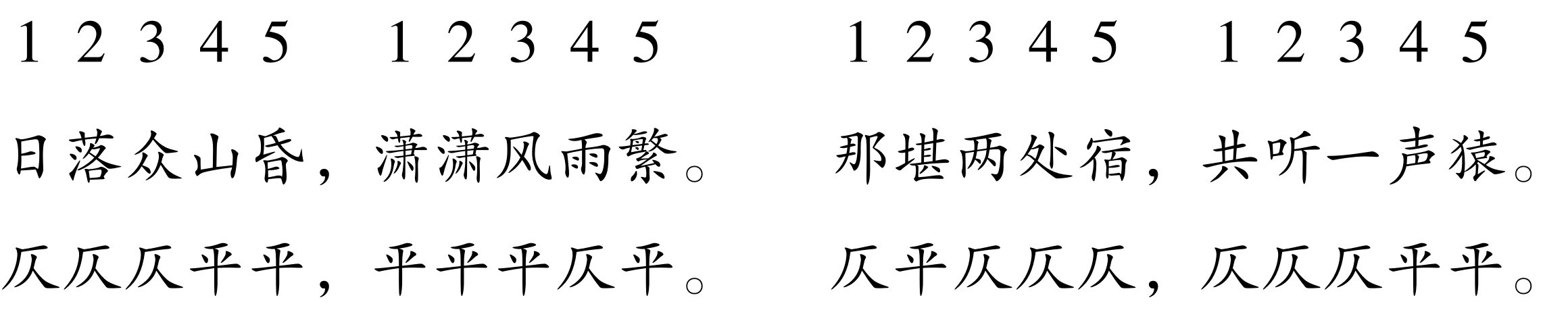通过观察可发现,每句诗2、4位置的汉字,平仄是相反的。如第一句“日落众山昏”,2、4位置是“落”和“山”,平仄相反;第二句“潇潇风雨繁”,2、4位置是“潇”和“雨”,平仄相反;第三句“那堪两处宿”,2、4位置是“堪”和“处”,平仄相反;第四句“共听一声猿”,2、4位置是“听”和“声”,平仄相反。由此我们可以总结,在五言近体诗的每一句中,2、4位置的两个字,平仄必然是相反的。第三句的第5字必定是仄声;第二、四句的第5字在韵脚上,因为近体诗押平声韵,这个位置的一定是平声;第一句的第5个字,如果入韵,则是平声,如果不入韵,则是仄声。至于第1字,通常与第2字平仄相同,第3字既可与第2字也可与第4字平仄相同,有一定的灵活性。这便是每句诗中的字要求平仄“相间”的原则。