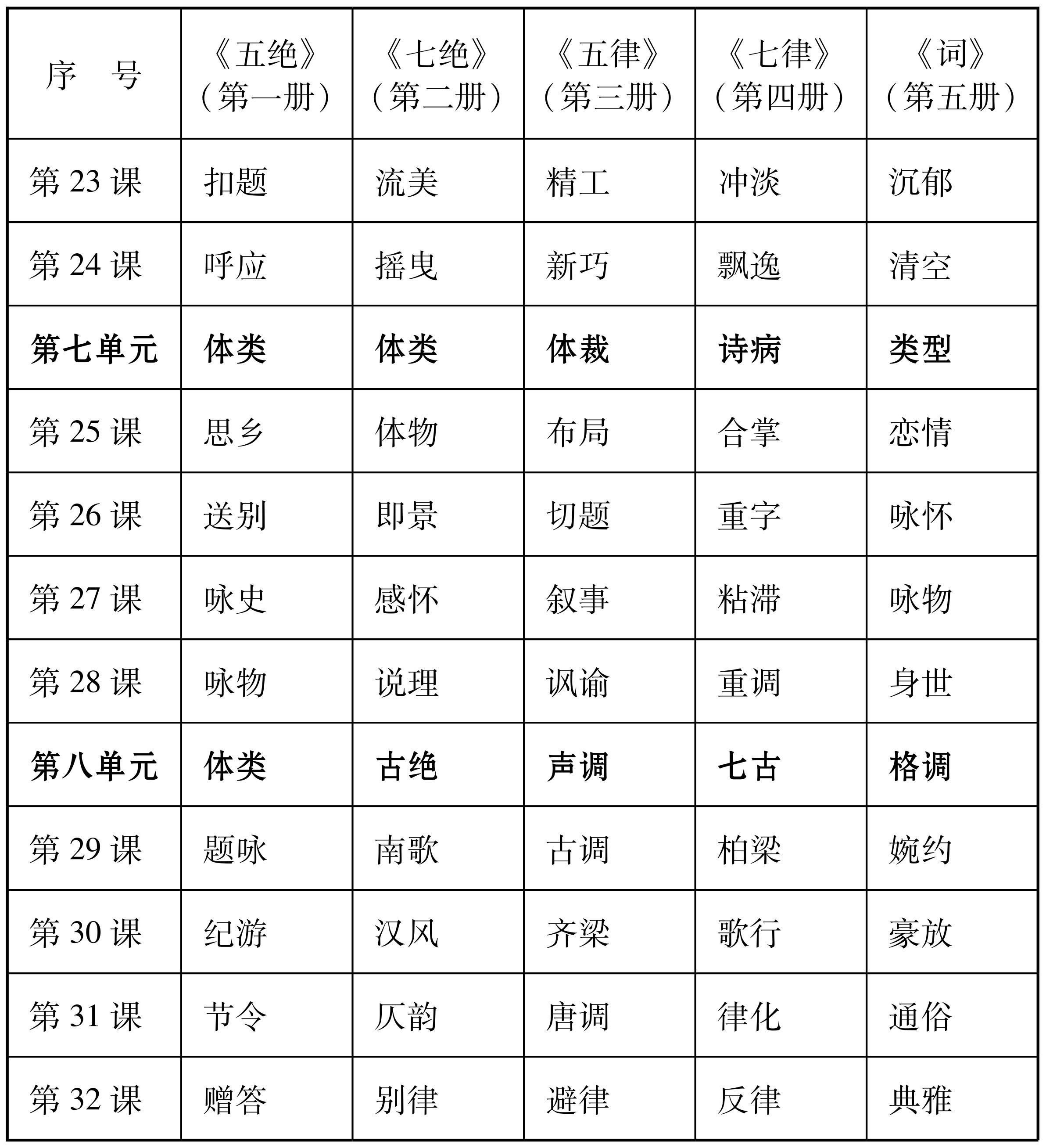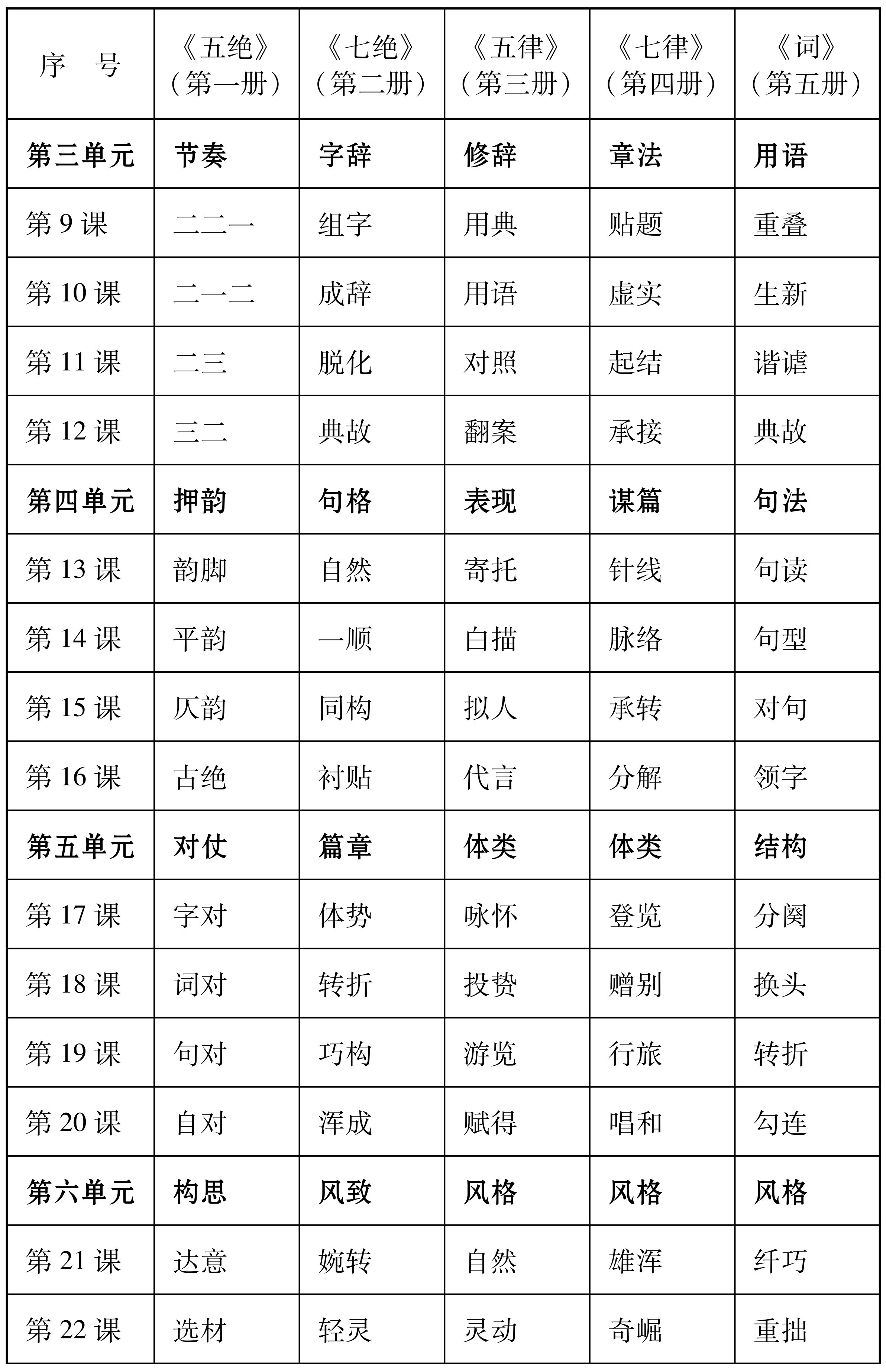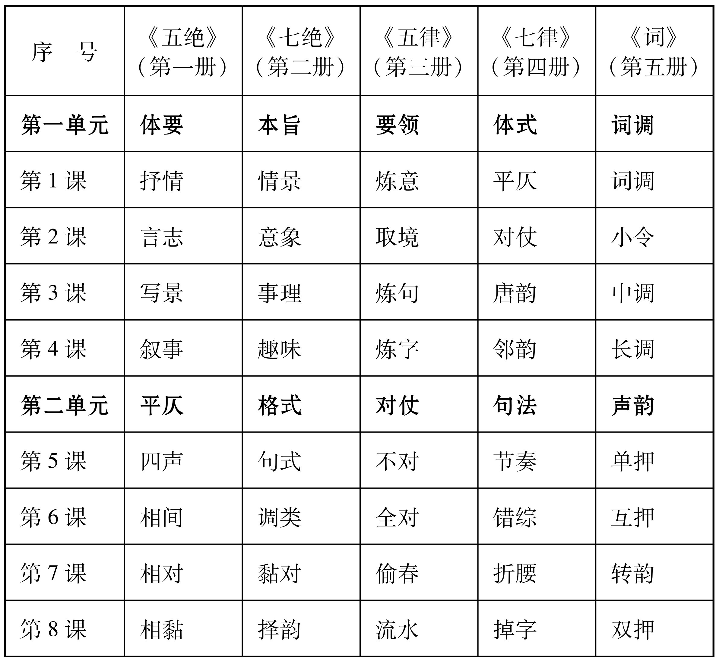 在内容编排上,每册安排八单元32课。单元导语概括本单元学习的核心内容。每单元分4课,以诗法和诗例标目。每课依次分为诗例、诗律、诗意、诗法、诗课等五个模块。“诗例”是每课的“抓手”,也是学习诗律和诗法的标本,入选作品以文质兼美、格律典型为依据;“诗律”通过对诗例进行平仄、押韵和对仗的分析,具体而微、分门别类地剖析诗词格律的基本知识;“诗意”概括诗例的基本内涵,为诗法的讲解作铺垫;“诗法”是每课的核心,以写作知识为主体,兼及必要的诗学知识,行文上或重点解析诗例的写法并略加引申,或从诗例入手,进行诗法的学习;“诗课”则是落实诗法学习的基本训练,“操千曲而后晓声,观千剑而后识器”,这种训练不局限于围绕诗例设置,而是具有一定的拓展性。