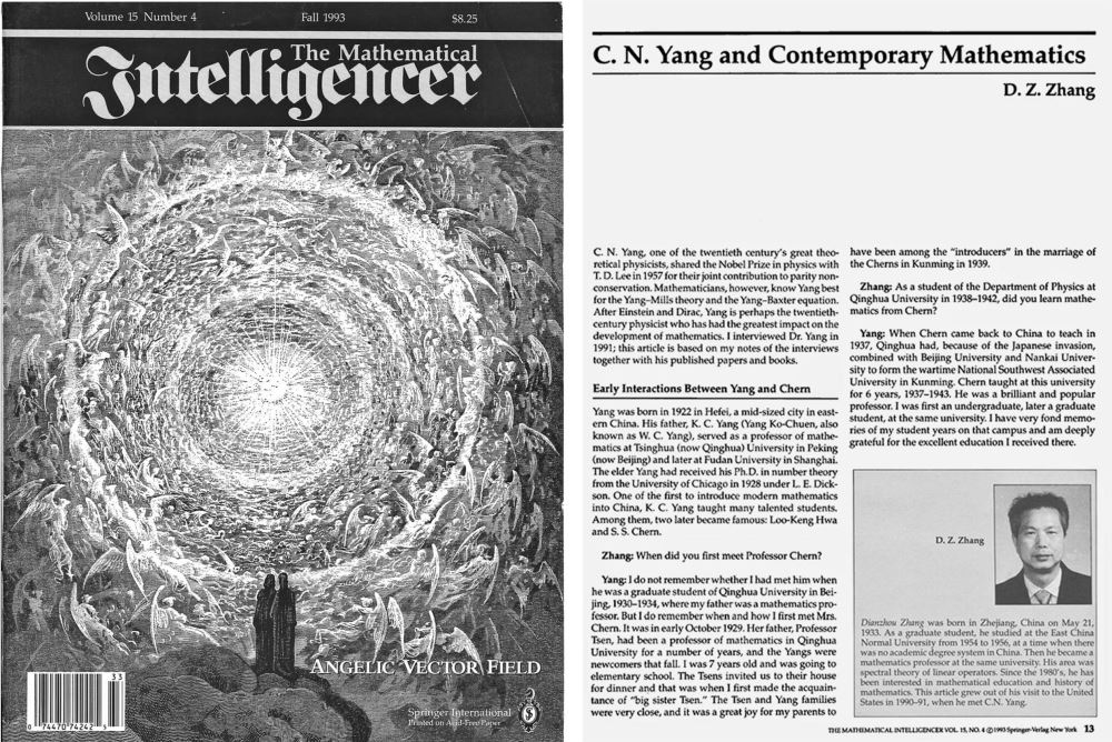 第一次见面以后不久,我就收到杨先生的正式信件,告诉我:“你如果愿意的话,CEEC基金可以资助你在纽约州立大学访问9个月。”在接下来的1991年,我继续做我的研究。如果杨先生在石溪,我往往会在星期三的中午,到杨先生那里谈话,把我的研究情况向他报告,同时把我们谈话的内容,整理成访谈录请他过目。从1991年6月,我完成了“杨振宁与当代数学”的中文初稿,然后在此基础上撰写英文稿 C. N. Yang and Contemporary Mathematics 。目的是向国际著名的数学杂志 The Mathematical Intelligencer 投稿。该杂志的中译名,有的是“数学情报”,有的是“数学益智”,还有是“数学信使”。据介绍,该杂志的任务是介绍数学、数学家、数学历史和文化。这份杂志,华东师范大学一直订阅,是我汲取国际数学进展信息的重要源泉。翻阅到1990年为止的杂志,我几乎没有看到来自大陆的中国人在上面发表过文章。鉴于杨振宁先生对当代数学的贡献,写这样的文章是容易被录取的。于是,我写信给该刊的通讯编辑之一的Karen Parshall,请她帮助审稿(她的丈夫Brian Parshall是代数学家,和我校王建磐教授有紧密的合作,我们在上海见过一面)。她很支持。与此同时,我也写信给米尔斯、巴克斯特(R.J.Baxter),请他们提供照片,他们都寄到编辑部去了。