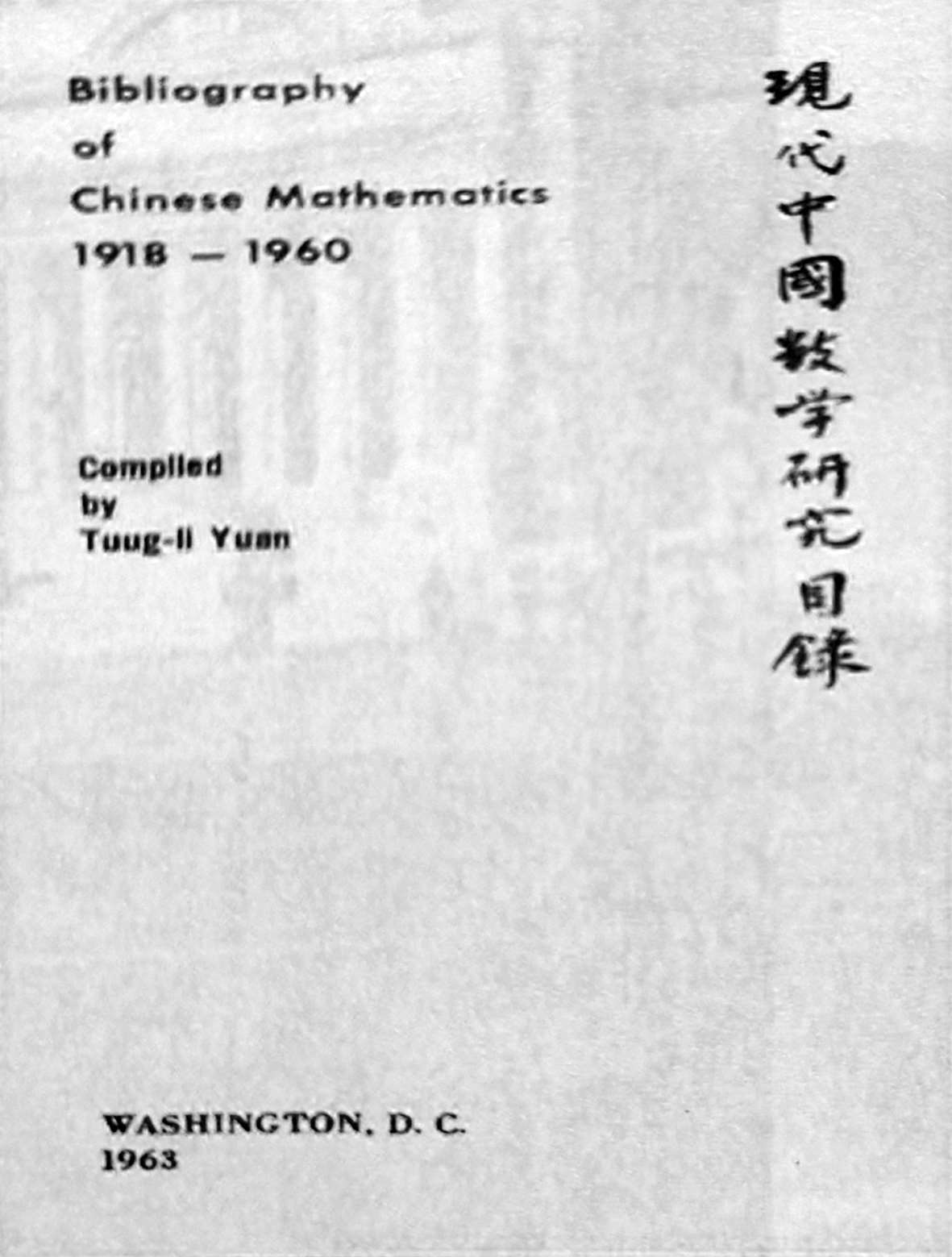 ●袁同礼编,《现代中国数学研究目录》,美国国会图书馆,华盛顿。在中美恢复建交之前的1963年出版,国内似没有藏本。我全文复印,并送给张友余、袁向东诸位先生,现在想必已经不难找到。