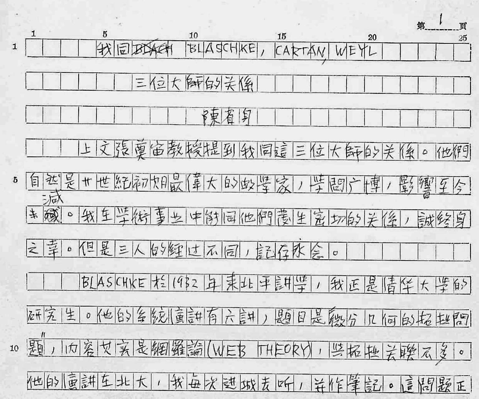 1986年春天,陈先生接受杭州大学、复旦大学和上海工业大学的名誉教授聘请,并作演讲。我知悉了陈先生将在上海工业大学延长路校区(现为上海大学延长校区)演讲的确切时间,就前往等待接见。演讲结束之后,我终于第一次走近陈先生,谈了我学习微分几何历史的情况。不久,他就寄给我一篇文章:“我同布拉施克、嘉当、外尔三位大师的关系”(手稿首页见图3),由我转给上海的《科学》杂志,在当年的第4期发表。