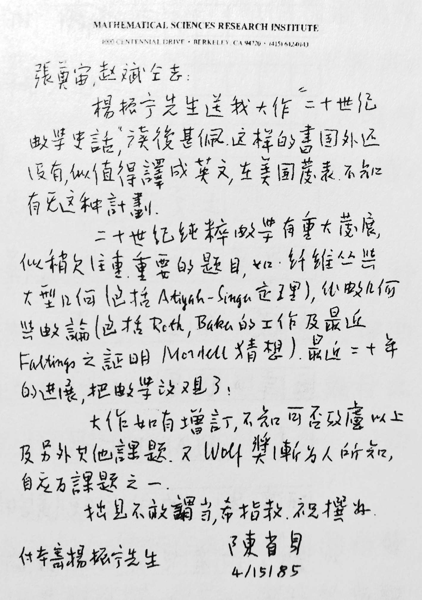 那是1985年,《二十世纪数学史话》在各个大学的书亭里都有出售。当年杨振宁先生访问复旦大学,和谷超豪先生等一起研究规范场。他在书亭里看到了这本书。由于其中有一节专门写了陈省身先生和杨振宁先生的工作,杨先生也带给陈先生一本。1985年“五一”节前夕,我突然接到陈省身先生的一封来信,全文如下: