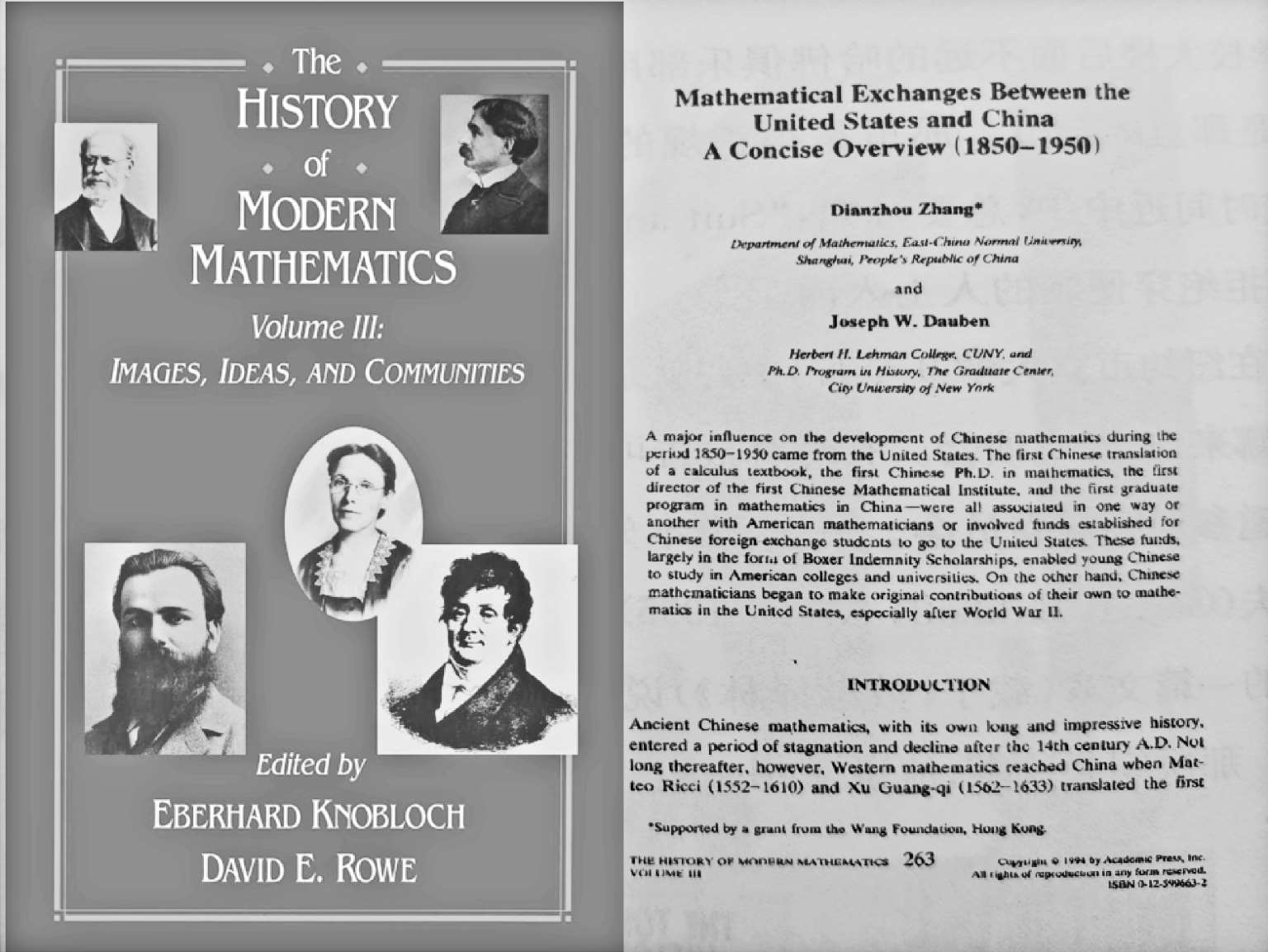 我和道本先生合作研究的课题是中美数学交流。最后形成一篇文章,我用英文写,他修改,最后收入E. Knobloch & D. E. Rowe编辑的 The History of Modern Mathematics , Vol.3: Images, Ideas, and Communities(现代数学史第三卷:形象、思想以及社团),由美国学术出版社(Academic Press)于1994年出版。