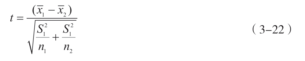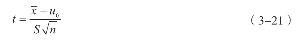 t 检验是用于比较样本均值与特定总体均值或两个独立样本均值之间差异是否具有统计学意义的方法。当计算所得 t 值对应的 P 值小于预先设定的显著性水平(如0.05或0.01)时,应拒绝原假设,判定组间均值存在显著差异;当 P 值大于等于显著性水平时,则接受原假设,认为组间均值差异无统计学意义。该方法主要适用于总体标准差未知且样本量较小(通常样本量<30)的研究场景。单样本 t 检验与双独立样本 t 检验的计算公式分别见式3-21与式3-22。