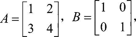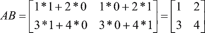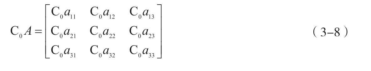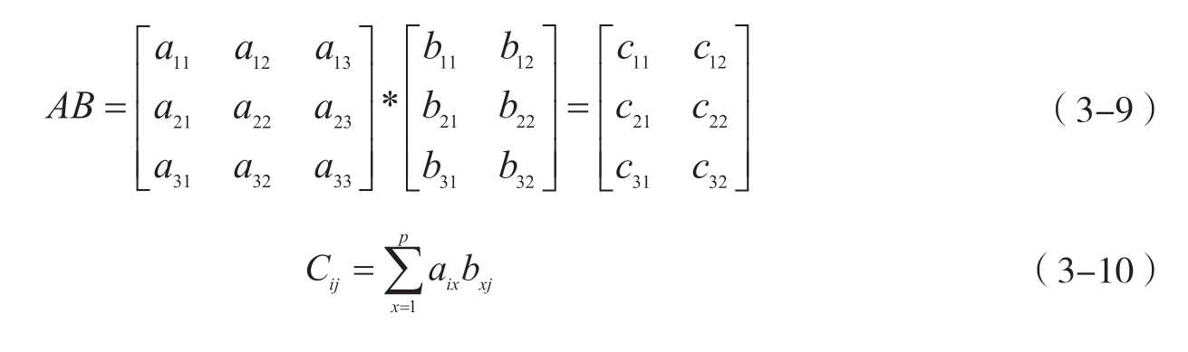 设 A 是m×p的矩阵, B 是p×n的矩阵,那么m×n的矩阵 C 称为矩阵 A 与 B 的乘积,记作 C = AB ,如 A 的大小是3×3, B 的大小是3×2,见式3-9。其中,矩阵 C 的第 i 行第 j 列元素等于矩阵 A 的第 i 行元素与矩阵 B 的第 j 列对应元素乘积之和,见式3-10。