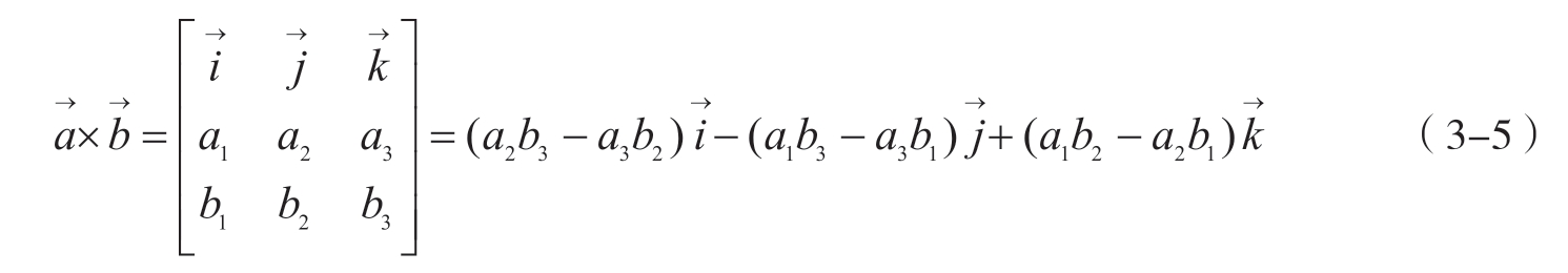 两个向量的叉积是一个新的向量,它垂直于原来的两个向量。叉积的模等于两个向量长度的乘积与它们之间夹角的正弦的乘积(式3-5)。叉积的方向由右手定则确定。
