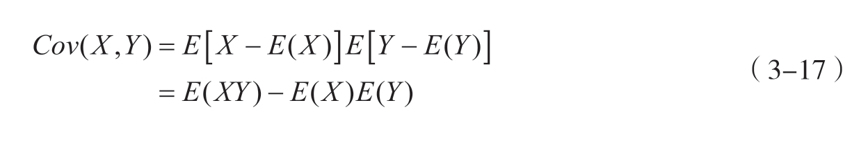 协方差是度量两个随机变量 X 与 Y 之间线性相关程度统计指标。该统计量表征当一个变量发生偏离时,另一变量协同变化的趋势。协方差的计算结果可为正数、负数或零,分别反映两变量间存在正向线性关联、负向线性关联或无线性相关性。协方差的表达式如式3-17所示。