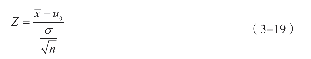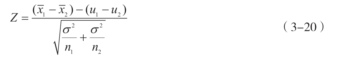Z 检验是基于正态分布理论的参数检验方法,用于检验单个样本的平均数与已知总体均值是否存在统计学差异,或比较两个独立样本均值间的统计学差异。 Z 检验主要用于大样本(通常不少于30)且样本数据满足正态分布或接近正态分布的情形,验证样本均值与总体均值或两个样本均值之间的差异是否显著。若 Z 值的绝对值小于或等于标准正态分布表中对应显著性水平(如0.05或0.01)的临界值时,则接受原假设,认为两个样本均值之间不存在差异,或样本均值与总体均值之间不存在显著性差异;若 Z 值的绝对值大于标准正态分布表中对应显著性水平(如0.05或0.01)的临界值时,则拒绝原假设,认为两个样本均值之间存在差异,或样本均值与总体均值之间存在显著性差异。单样本 Z 检验与双独立样本 Z 检验的计算公式分别见式3-19与式3-20。
