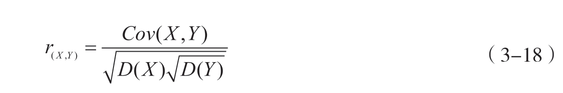 相关系数是协方差与两随机变量标准差乘积的比值,用于量化表征随机变量 X 与 Y 间的线性关联强度。当该系数绝对值趋近于1时,表明变量间存在较强的线性关联;当绝对值趋近于0时,则反映变量间线性关联程度较低。相关系数的表达式如式3-18所示。
