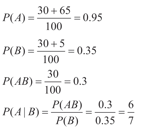例4: 设两台车床加工同类型零件共计100件,具体加工数据:①第一台车床产量:合格品30件,次品5件;②第二台车床产量:合格品与次品合计65件(具体质量分布未知)。定义随机事件 A 为“从全部产品中随机抽取一件为合格品”,事件 B 为“随机抽取的产品产自第一台车床”。