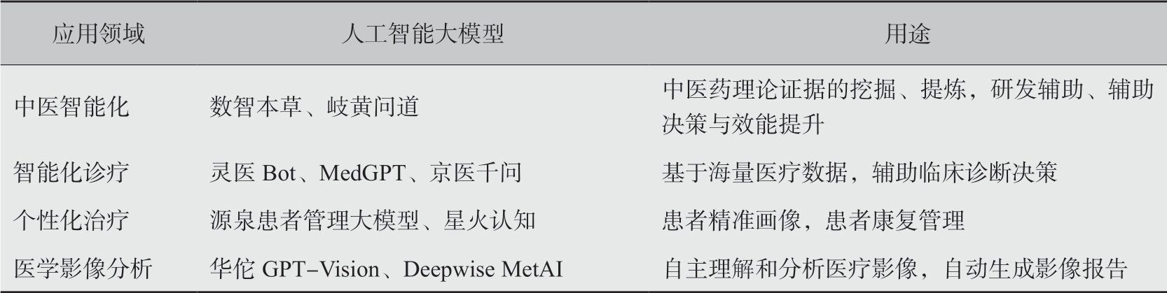 医疗领域与人工智能技术的结合在多个行业中具有较高应用潜力。人工智能技术对医疗产业的赋能效应,不仅体现在医疗活动中的成本优化与效率提升,更推动着整个医疗产业链的转型升级。当前,人工智能技术已在中医药智能化研究、辅助诊疗系统开发、个体化治疗方案制定、医学影像分析等领域取得实质性应用进展,部分国产医疗人工智能大模型的应用现状详见表1-1,逐步形成“人工智能+健康医疗”的创新应用范式。
