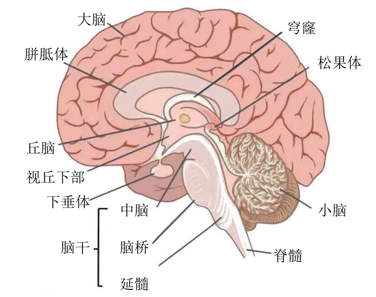 神经系统由中枢神经系统和周围神经系统两部分组成。中枢神经系统由脑和脊髓组成;周围神经系统由脑发出的12对脑神经和脊髓发出的31对脊神经,以及植物性神经(包括交感神经、副交感神经)组成。其中,脑位于颅腔内,由四个主要部分组成:大脑、小脑、脑干[包括延髓(脑)、脑桥和中脑]和间脑(图2-1)。脊髓位于脊柱的椎管内,它将所接收的信息刺激传达到脑,再把脑的指令下达到各个器官,起到上传下达的作用。脊髓中还存在一些参与基本反射(如排尿反射、排便反射、膝跳反射等)的神经中枢。