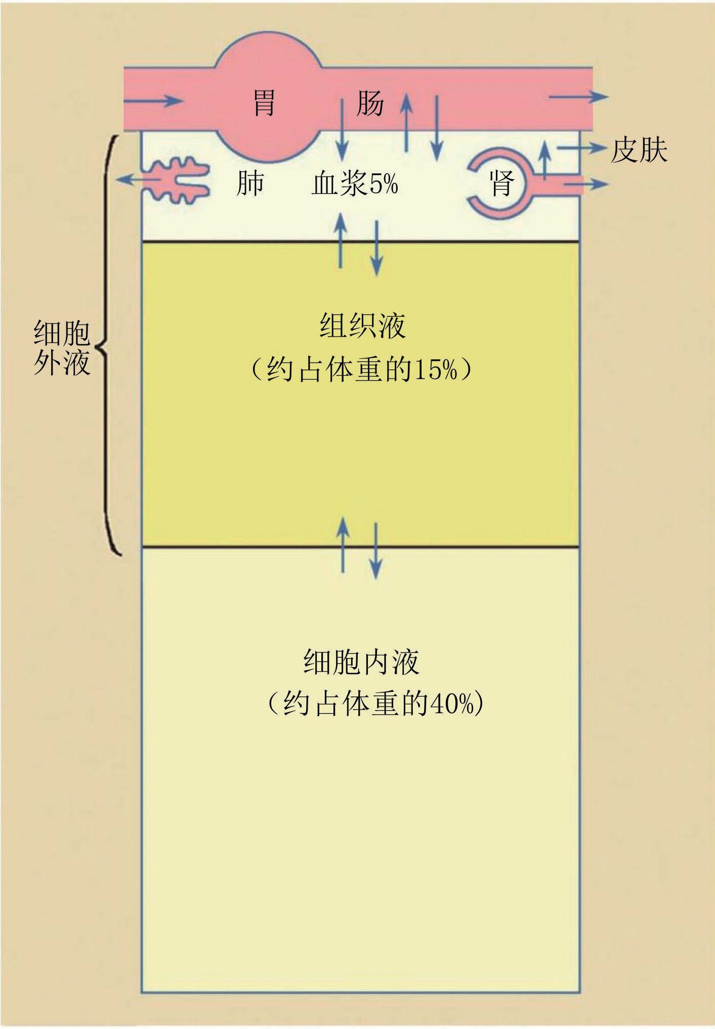 体液是机体内液体的总称(图1-1)。正常成人的体液约占体重的60%,40%分布在细胞内,称为细胞内液;另外20%分布于细胞外,称为细胞外液。细胞外液中组织液约占15%,血浆约占5%。此外,还有少量的淋巴液、脑脊液等也属细胞外液。