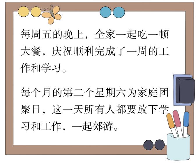 每个月有一天为家庭团聚日,这一天所有人都要放下学习和工作,一起郊游或野炊或做其他所有人都能参与的事情。