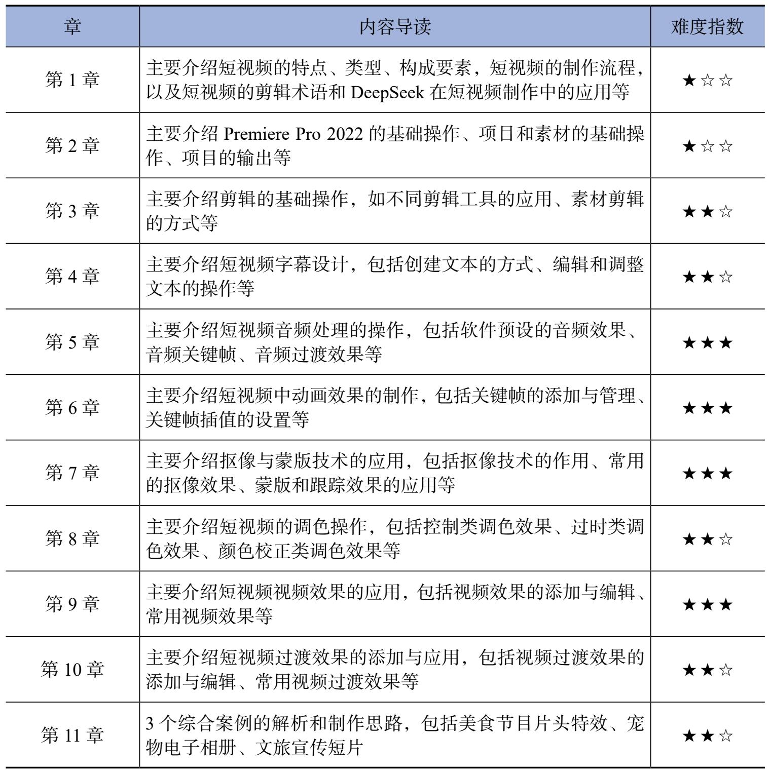 本书对Premiere Pro 2022的应用功能及操作技巧进行讲解,并结合DeepSeek工具讲解短视频脚本制作创意方案生成、给视频配乐、文案生成等相关知识,精选内容创作平台的热门案例,帮助读者掌握短视频的制作方法。读者通过掌握本书系统性的知识结构,不仅可以了解软件的各项功能,还能培养自己的创新思维和审美意识,最终掌握从项目策划到后期制作的一系列操作技巧。