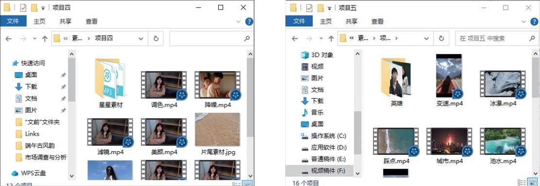 ●素材和效果文件: 提供正文讲解、课后实训中案例的素材和效果文件。本书案例素材文件所在位置表示方式:\素材文件\项目编号\素材文件名,如“\素材文件\项目四\小清新调色.mp4”。本书案例效果文件所在位置表示方式:\效果文件\项目编号\效果文件名,如“\效果文件\项目四\小清新调色.mp4”。