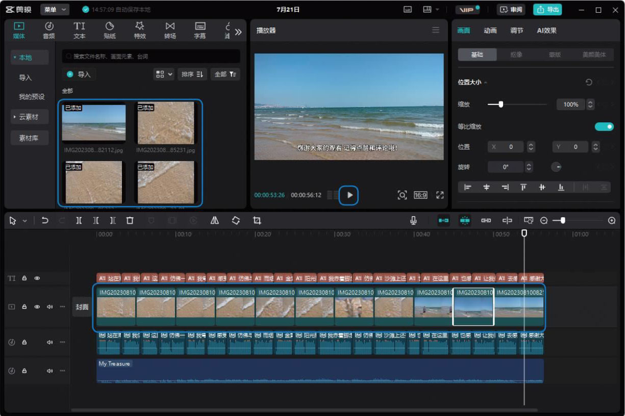③剪映将根据文案自动生成短视频,并在剪映的视频编辑主界面中显示短视频的所有素材和最终效果。