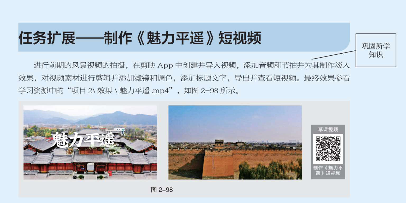 本书案例效果文件所在位置:项目编号\效果\案例名。如项目2\效果\斜街印象.mp4。