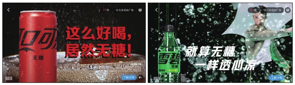“说什么”是电视广告创意的深刻内涵,而“怎么说”则是电视广告创意的表现形式,只有当内涵和形式有机统一时,“说什么”和“怎么说”才能融合得更好。图1-3所示为可口可乐、雪碧无糖系列广告。
