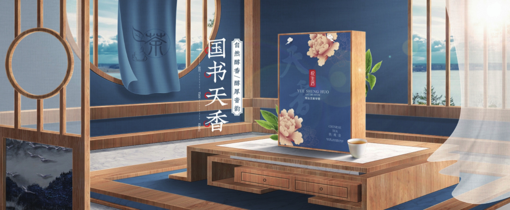 图2-2所示的商品海报,其主色调是蓝色,这是一种典型的冷色,代表着冷静和宁静。房间的背景墙、左侧窗帘和地板都采用了不同程度的蓝色,为整个空间营造了一种清新、安静的氛围。同时搭配木制家具的棕色、暖黄色,为空间带来了一丝温暖和亲切感。白色茶杯和文字为空间增添了一抹纯净和明亮,同时也与其他颜色形成了良好的呼应。