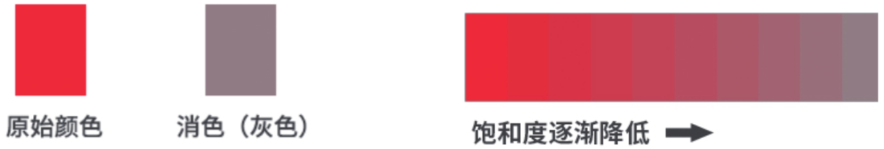 纯度也叫“饱和度”,是指色彩的纯净或者鲜艳程度(后文统称为“饱和度”)。饱和度越高,颜色越鲜艳,视觉冲击力越强。饱和度的高低取决于该颜色中含色成分和消色成分(灰色)的比例。含色成分越高,饱和度越高;消色成分越高,饱和度越低,如图2-6所示。
