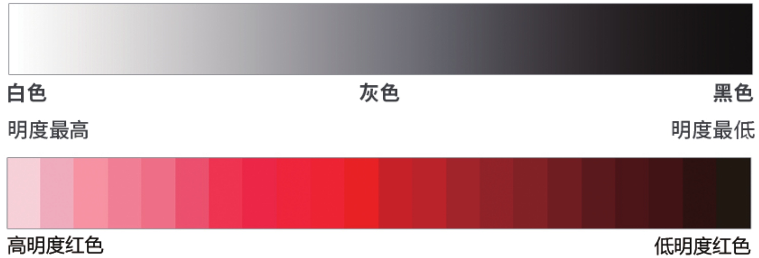 除了色相外,明度也是影响色彩感受的一大因素。明度是指色彩的明亮程度,即有色物体由于反射光量的区别,而产生颜色的明暗强弱。通俗地讲,在红色里添加的白色越多,则视觉效果越亮,添加的黑色越多,则视觉效果越暗,如图2-3所示。