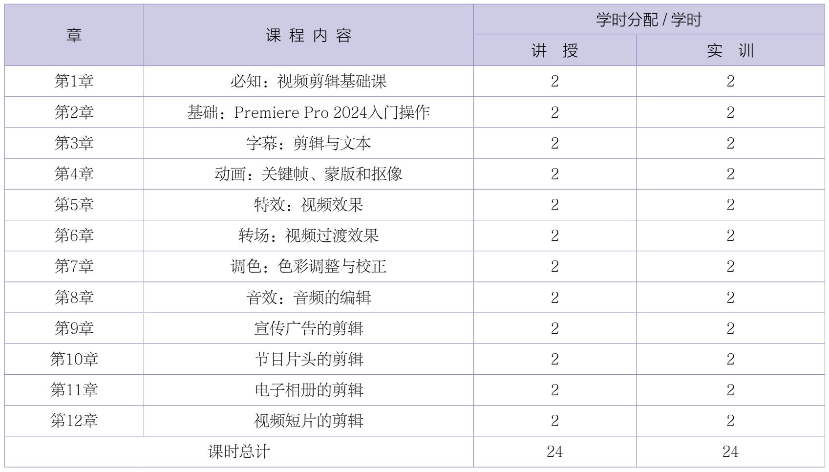 全书共12章,第1章对视频编辑的理论知识进行介绍,第2~8章以理论结合实操的形式对Pre miere Pro 2024软件的功能进行解析,第9~12章分别对宣传广告、节目片头、电子相册,以及视频短片的剪辑进行介绍。通过对本书的学习,读者可以了解视频编辑的基础理论,熟悉Premiere Pro 2024的使用方法与技巧,提高读者使用Premiere Pro 2024进行视频编辑的能力。