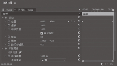 Step 04 选中V1轨道中的第1段素材,在“效果控件”面板中设置“位置”参数,并添加关键帧,如图1-27所示。