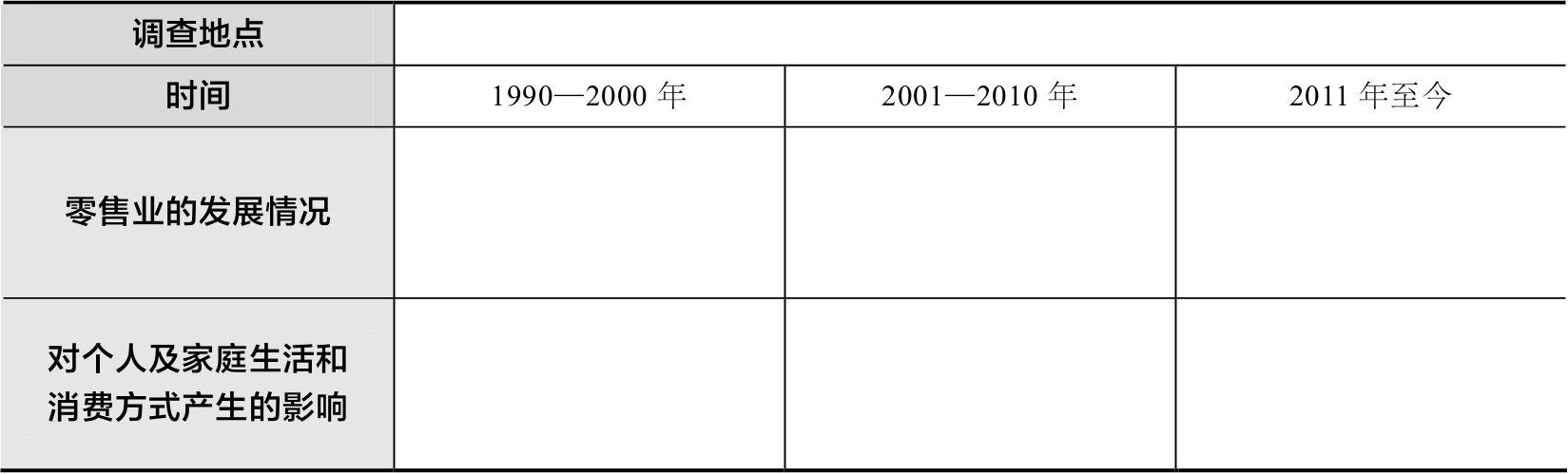 【实训过程设计】学生分成3~4人一组,调查自己家乡或学校所在地零售业的发展情况,分析这些变化对个人及家庭生活和消费方式产生的影响。将分析结果填入表1-1中,上课时由老师进行点评。