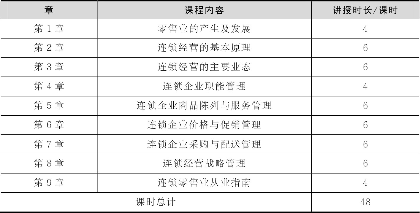 由于连锁经营在管理方法和技术水平上发展迅速,企业的大量实践经验还无法有效地收集和整理,加上编者对高职、高专教育阶段连锁经营相关知识的认识也有待进一步提高,因此书中难免存在疏漏之处,恳请读者谅解并提出宝贵建议。