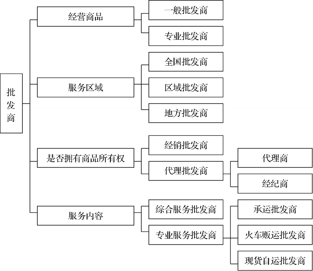 批发商可按经营商品、服务区域、是否拥有商品所有权和服务内容等进行分类,具体分类如图1-1所示。