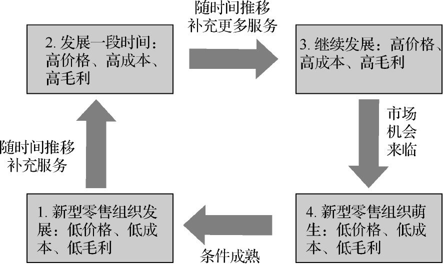 从图1-2中可以看出,新型零售组织最初都采用低价格、低毛利、低成本的经营模式,以低价来吸引消费者,形成自身优势。但随着新兴业态市场份额的扩大,这必然会引起效仿,导致市场竞争加剧。结果,无论是初始创新者还是模仿者,都只能采取除降低价格以外的其他营销策略来形成差异化,如增加商品组合、提高服务水平、改善购物环境等。随着成本的不断增加,初始创新的零售业态逐步演变为高价格、高成本、高毛利的业态,最终被低价格、低成本、低毛利的新业态取代,于是轮子又重新转动。零售市场上的新、旧零售业态,就这样不断循环下去。