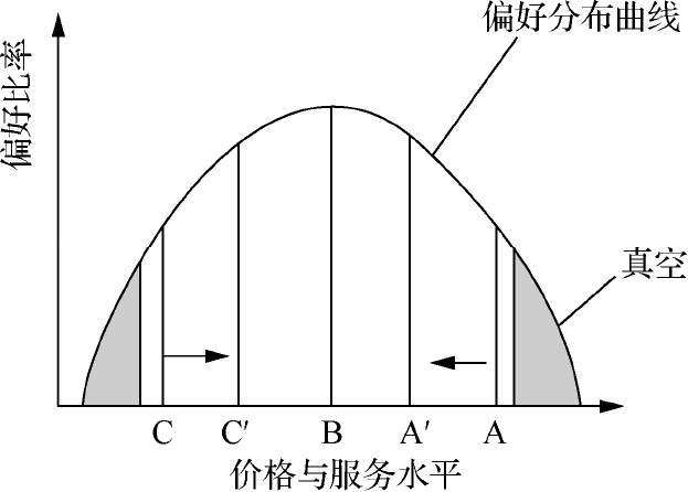 其次,该理论又假设存在一组由高到低的服务与价格组合带,以及消费者对不同水平的价格与服务组合的偏好分布曲线。零售商提供的价格与服务水平是低低、中中、高高等组合中的某一种,假定消费者偏好的价格与服务水平的分布呈单峰形,则偏好低低和高高组合的消费者分布的区域要比偏好中中组合的消费者分布的区域相对狭小。现存的零售业态只能满足其中的部分需求。因而在零售市场上存在一些空缺或真空地带,从两端加入的业态受业态内竞争的压力,被挤向消费者偏好分布的中心,于是两端形成了真空地带。新进入者以这个真空地带为目标市场进入零售业,从而产生新的业态。也就是说,低价低级店和高价高级店作为新的业态诞生了。