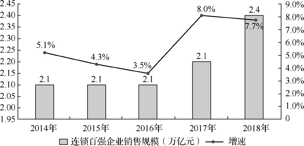 ① 连锁规模持续扩大。中国连锁经营协会数据显示,2018年,我国连锁百强企业销售规模为2.4万亿元,同比增长7.7%(见图1-12),占社会消费品零售总额6.3%,较上年提高0.3个百分点。连锁百强企业门店总数达13.8万个,同比增长16.0%。其中连锁百强企业线上销售额同比增长55.5%,增速比全国线上商品零售高出一倍以上。2018年,我国特许百强企业销售规模约4300亿元,同比增长14.8%,增幅比上年提高1.8个百分点;门店总数达17.7万个,同比增长15.1%,增幅比上年提高4.1个百分点。其中有19家特许百强企业在海外发展加盟业务,“一带一路”为特许百强企业提供了更加广阔的发展空间。
