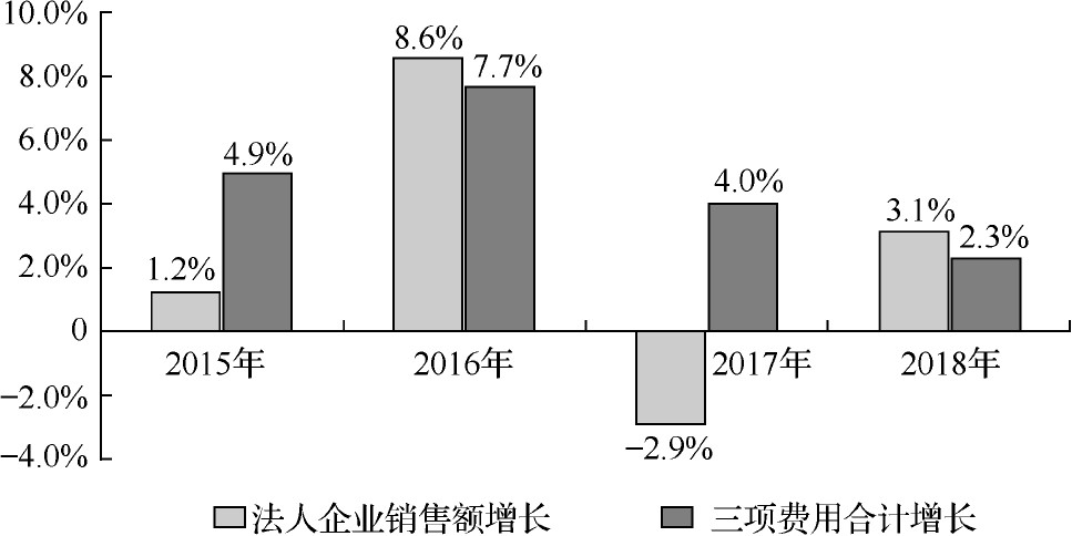 图1-6 2015—2018年限额以上大中型法人企业销售额及三项费用合计增长情况