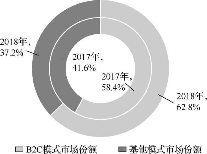图1-8 2017—2018年全国网络零售B2C模式及其他模式市场份额