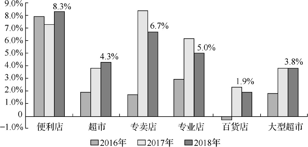 图1-11 2016—2018年商务部零售业典型统计调查分业态增速