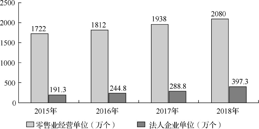 根据国家统计局数据和商务部典型零售企业统计数据,2018年我国零售业经营单位共有2080万个,同比增长7.8%,增速比上年提高0.9个百分点。其中,法人企业单位数量为397.3万个,同比增长23.7%,占全部经营单位的19.1%,如图1-5所示。