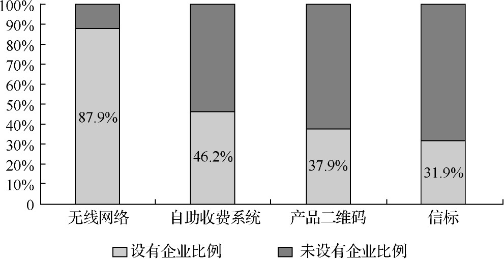 ③ 百货行业继续回暖。中国百货商业协会调查显示,2018年90家样本企业销售额同比增长4.2%,利润总额同比增长6.4%,经营面积同比增长2.1%,费用总额同比下降3.7%,从业人员减少3.1%。其中,多业态融合发展成为趋势,样本企业涉足超市、购物中心、便利店的比例分别为73.0%、49.6%和32.1%;科技创新成为重要抓手,应用科技的样本企业中,87.9%设有无线网络,46.2%设有自助收费系统,37.9%设有产品二维码,31.9%设有信标用于客流分析,如图1-14所示。百货龙头正在成为多业态聚合的载体平台,数字化应用将进一步拉近企业与消费者间的距离。