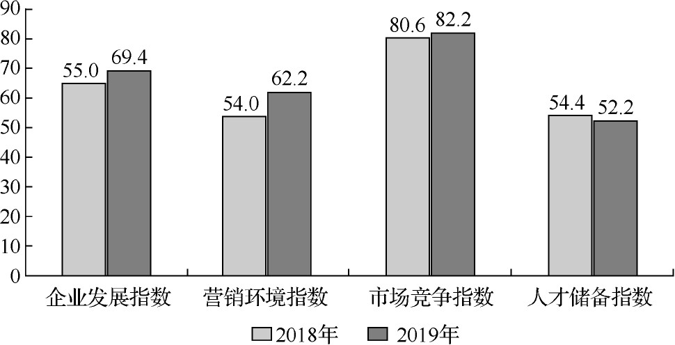② 便利店发展势头良好。2018年,限额以上便利店销售额同比增长11.5%,增速比实体零售平均增速高6.9个百分点;商务部重点监测便利店销售额增长7.9%,增速比上年快0.5个百分点。中国连锁经营协会统计显示,2018年连锁百强企业中,便利店业态销售额平均增长21.1%,门店总数增长18%,增速分别比整体高13.4和8.9个百分点,连续3年在零售业态中保持最快水平。从发展潜力看,2018年便利店企业发展指数为55.0,营商环境指数为54.0,市场竞争指数为80.6,人才储备指数为54.4,均高于荣枯线,如图1-13所示。在商品结构上重视引入鲜食类商品,开展线上业务及送货到家等品质运营,这些措施成为推动便利店销售额增长的积极因素。