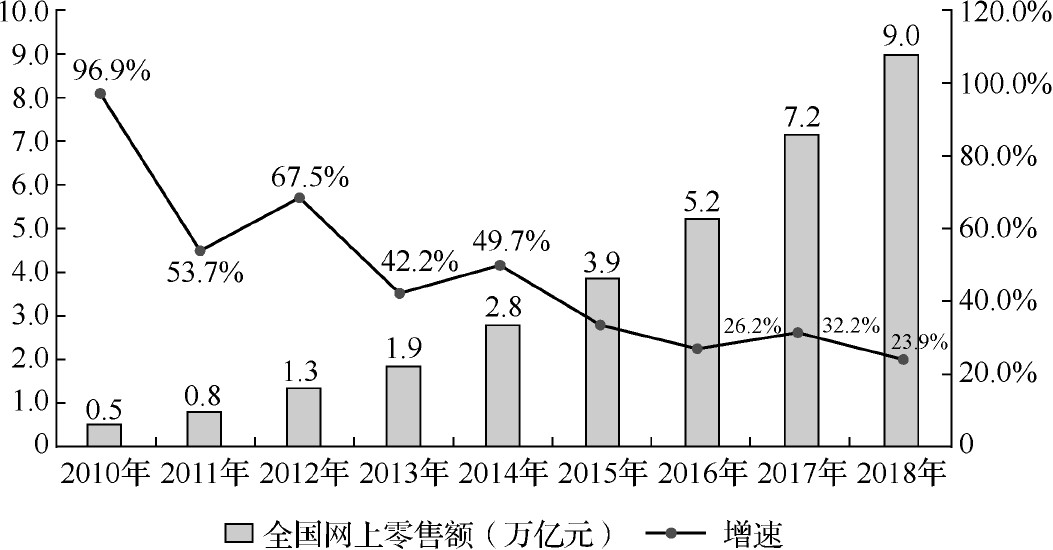 图1-7 2010—2018年全国网上零售交易规模及增速