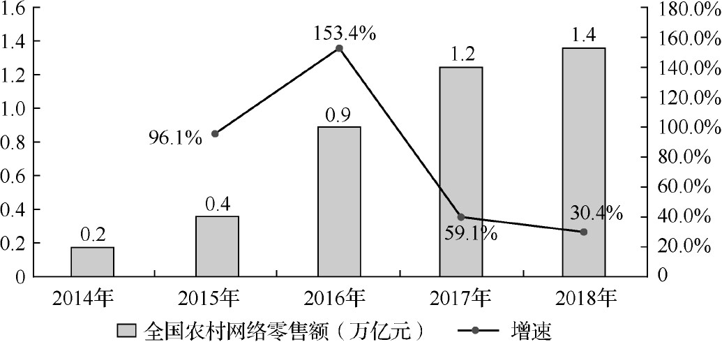 ② 农村电商迅猛发展。商务大数据监测显示,2018年全国农村网络零售额达到1.4万亿元,同比增长30.4%,如图1-9所示。全国农产品网络零售额达到2305亿元,同比增长33.8%。