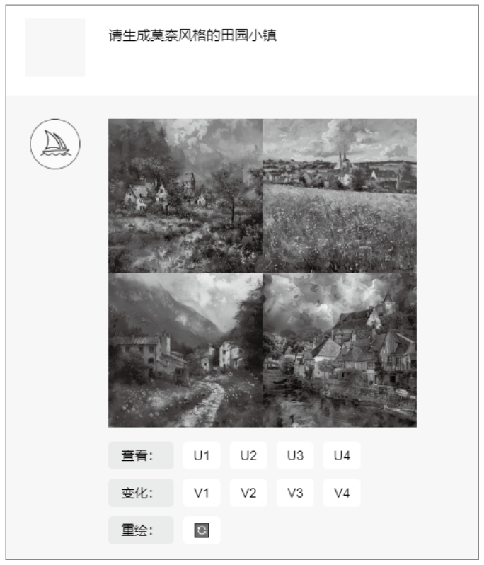 AIGC可以通过学习不同风格的设计作品实现风格的自动迁移和模仿。设计师可以指定目标风格,让AIGC将现有设计转化为该风格,从而提高设计的多样性和创新性。图1-27、图1-28所示分别为利用Midjourney生成的莫奈风格与王希孟《千里江山图》风格的插画。