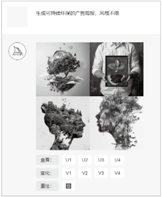 利用深度学习和神经网络技术,AIGC可以根据设计师提供的关键词、描述,甚至其他视觉参考素材自动生成一系列新颖的设计草图或初步构想,帮助设计师打破思维局限,拓宽设计视野。图1-21、图1-22所示分别为利用AI绘画工具Midjourney生成的设计灵感。