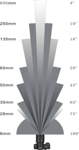 镜头焦距的长短与感光元件的大小一样,都会影响最终所拍摄画面的视角大小。较短焦距所拍摄的大视角接近180°,而较长焦距所拍摄的画面视角要小于10°。即焦距越长则视角越小,画面中可容纳的景物就越少;焦距越短则视角越大,画面中能够容纳的景物也越多。