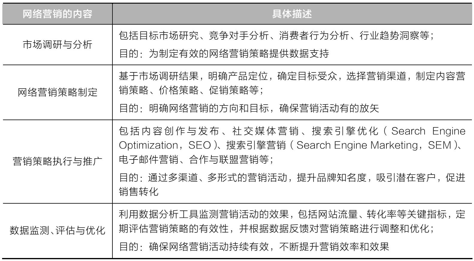网络营销是企业利用互联网平台进行产品推广、品牌建设和客户关系管理的重要手段。它涉及的范围比较广,涵盖的内容也比较丰富。具体来说,网络营销的内容主要包括以下几个方面,如表1-1所示。