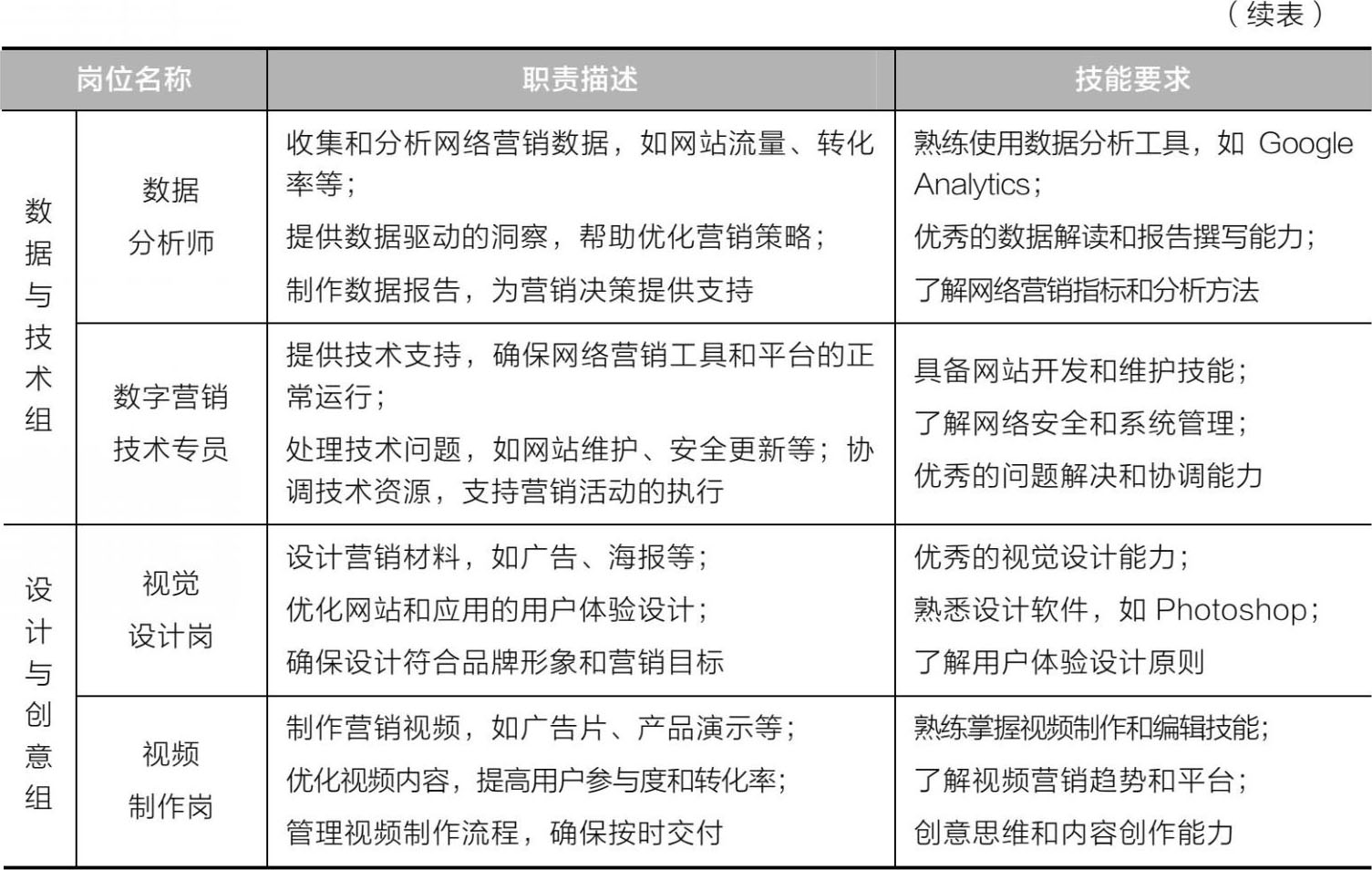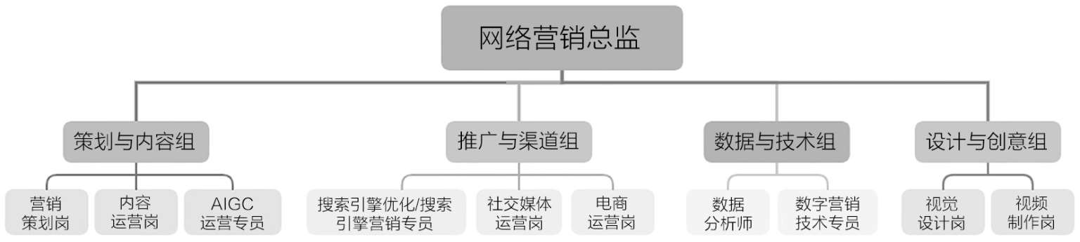 网络营销部门人事设置一般包括多个专业团队,以确保营销活动的全面性和高效性,如图1-2所示。这种结构化的人事设置旨在通过不同职能人员的协同合作,实现从策略制定到执行监控的全方位网络营销管理。
