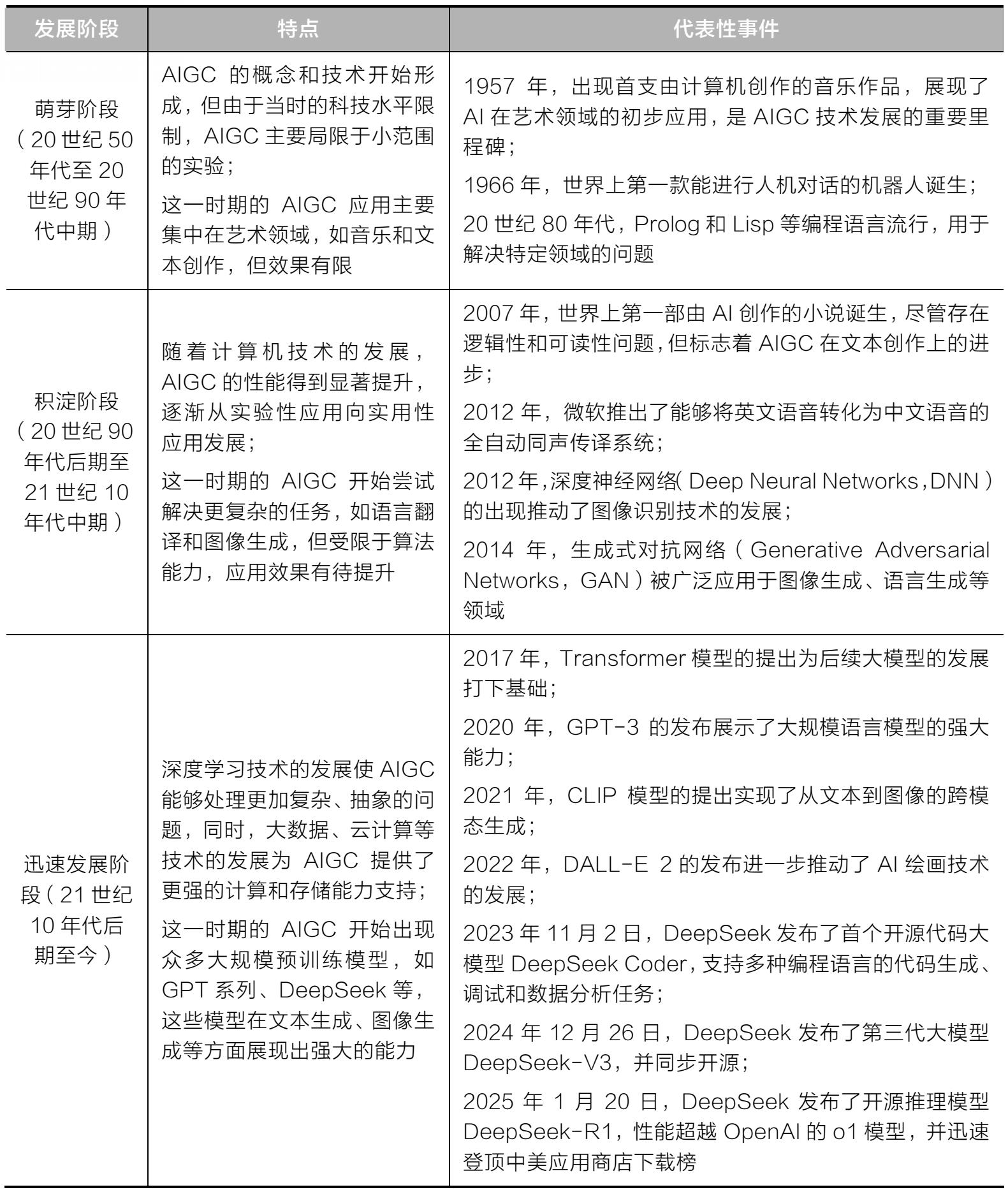 AIGC的发展历程可以分为3个阶段,如表1-3所示。
