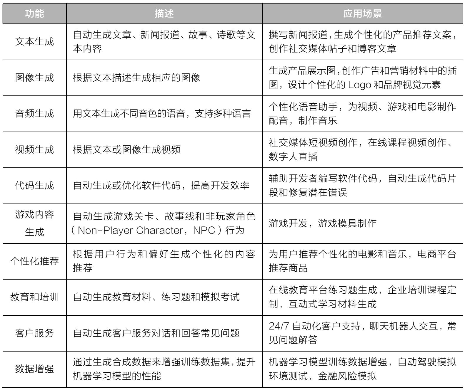 AIGC具有强大的内容生成能力,其主要功能与应用场景如表1-4所示。